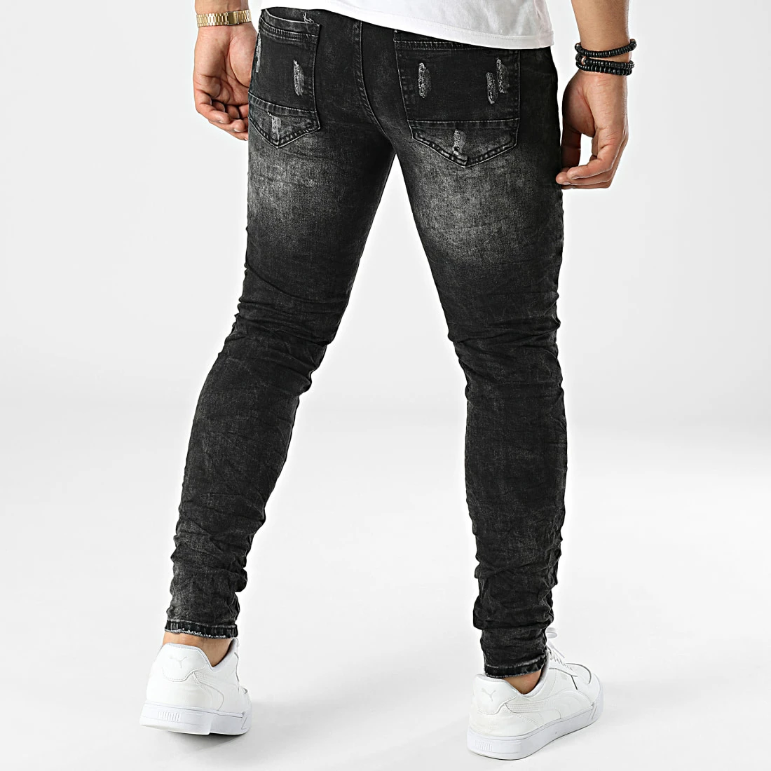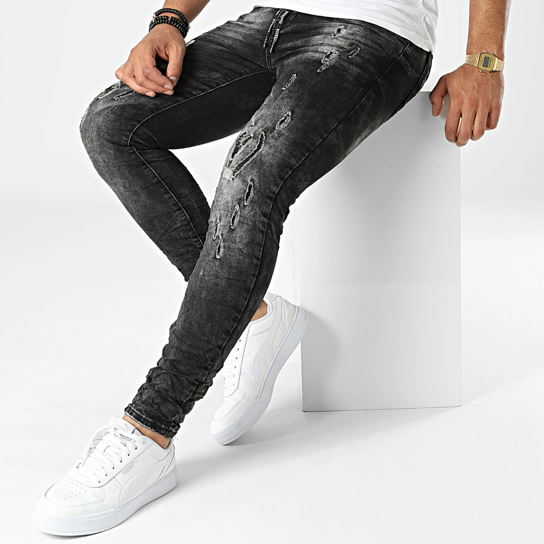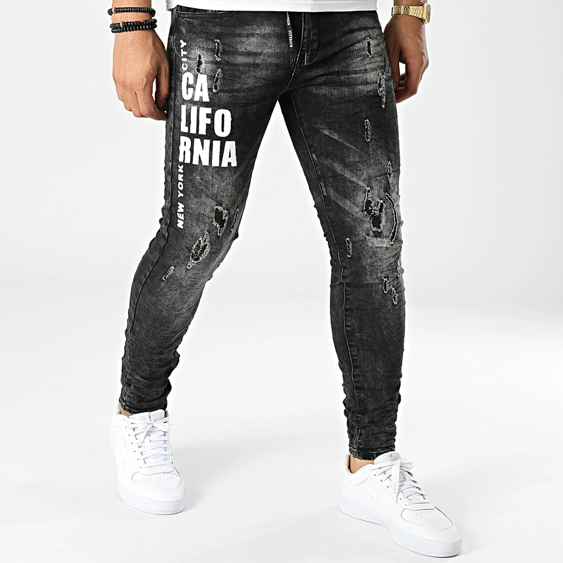 âąÂ Jean skinny tendance finition usĂ©e et dĂ©lavĂ©e avec trous apparents et impressions