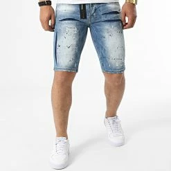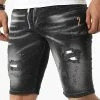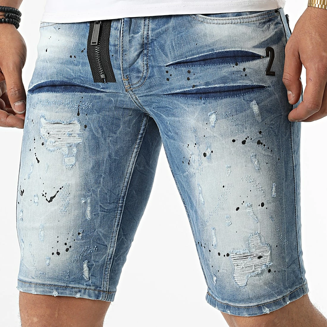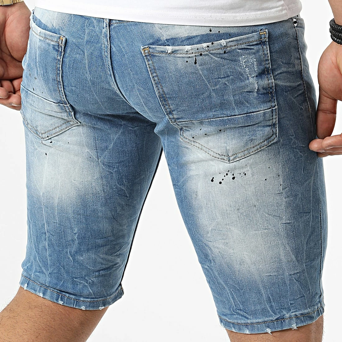• Short en jean tendance finition délavée, tachée et usée avec rapiéçages