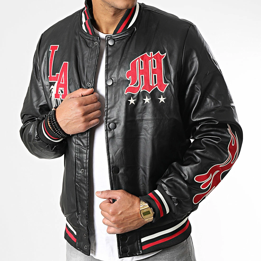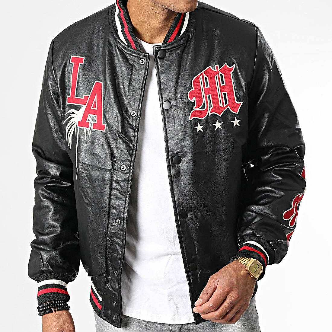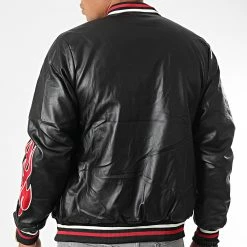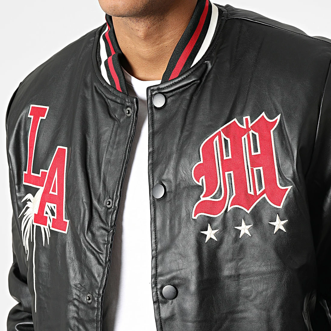 • Veste teddy style baseball aspect cuir tendance avec visuels brodés à l’avant et sur la manche